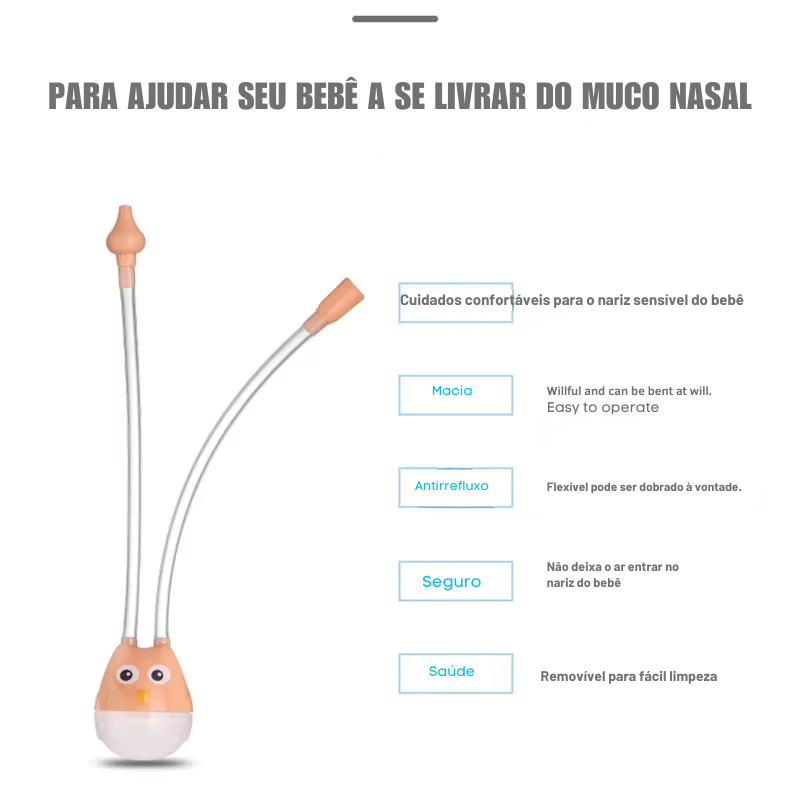 💨 Sugador Nasal (Aspirador): O sugador nasal é a ferramenta perfeita para remover o excesso de muco de forma rápida e segura. Ele alivia instantaneamente o desconforto, ajudando seu bebê a respirar, mamar e dormir muito melhor.
